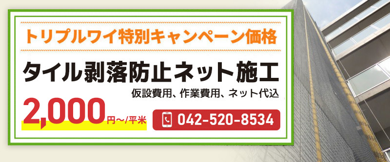 また、剥落防止ネットの費用の目安ですが、15~16階のマンションの1面に施工すると仮定した場合、平米3,000円〜(仮設費用、作業費用、ネット代こみ)になります。